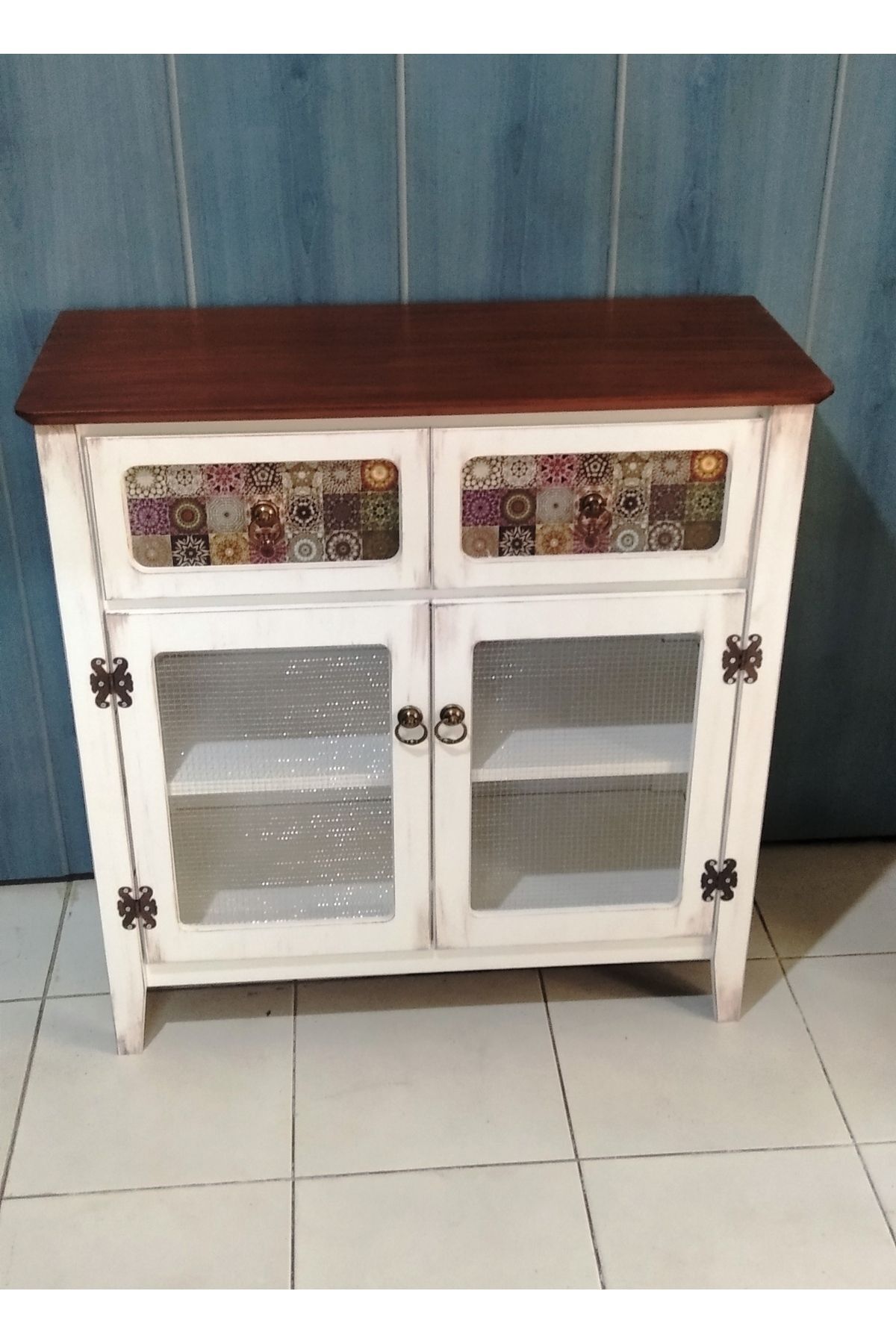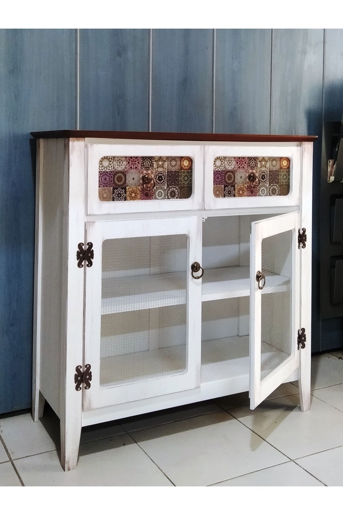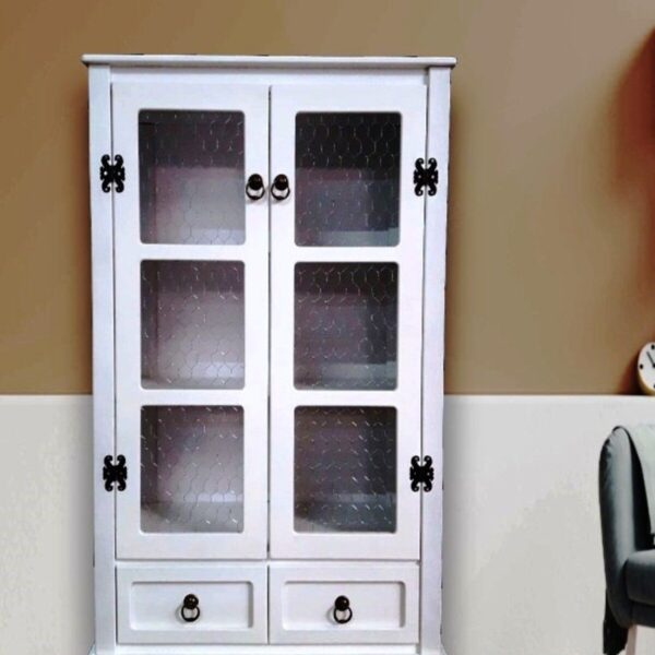 Telli dolap 2 çekmeceli beyaz eskitme